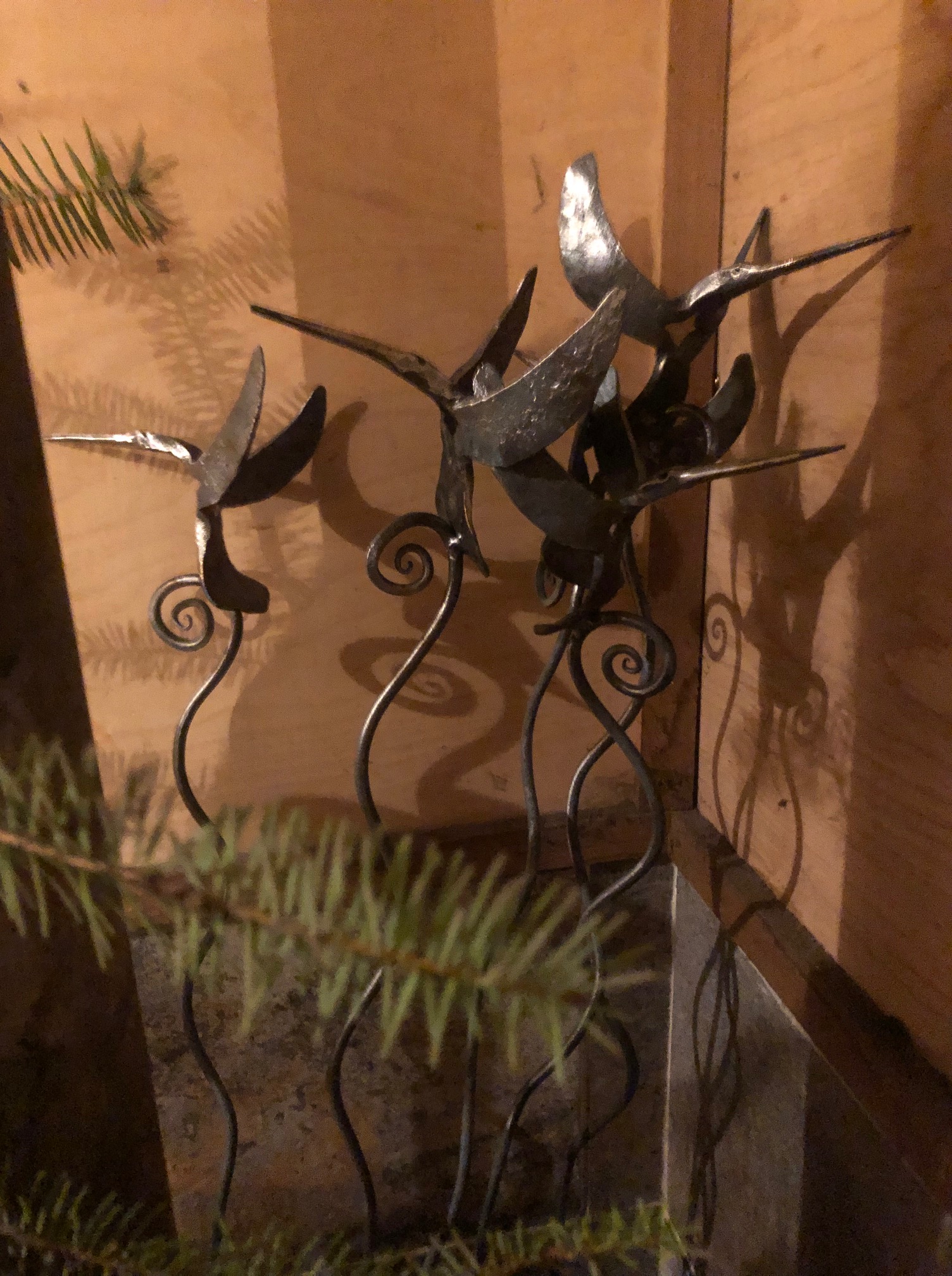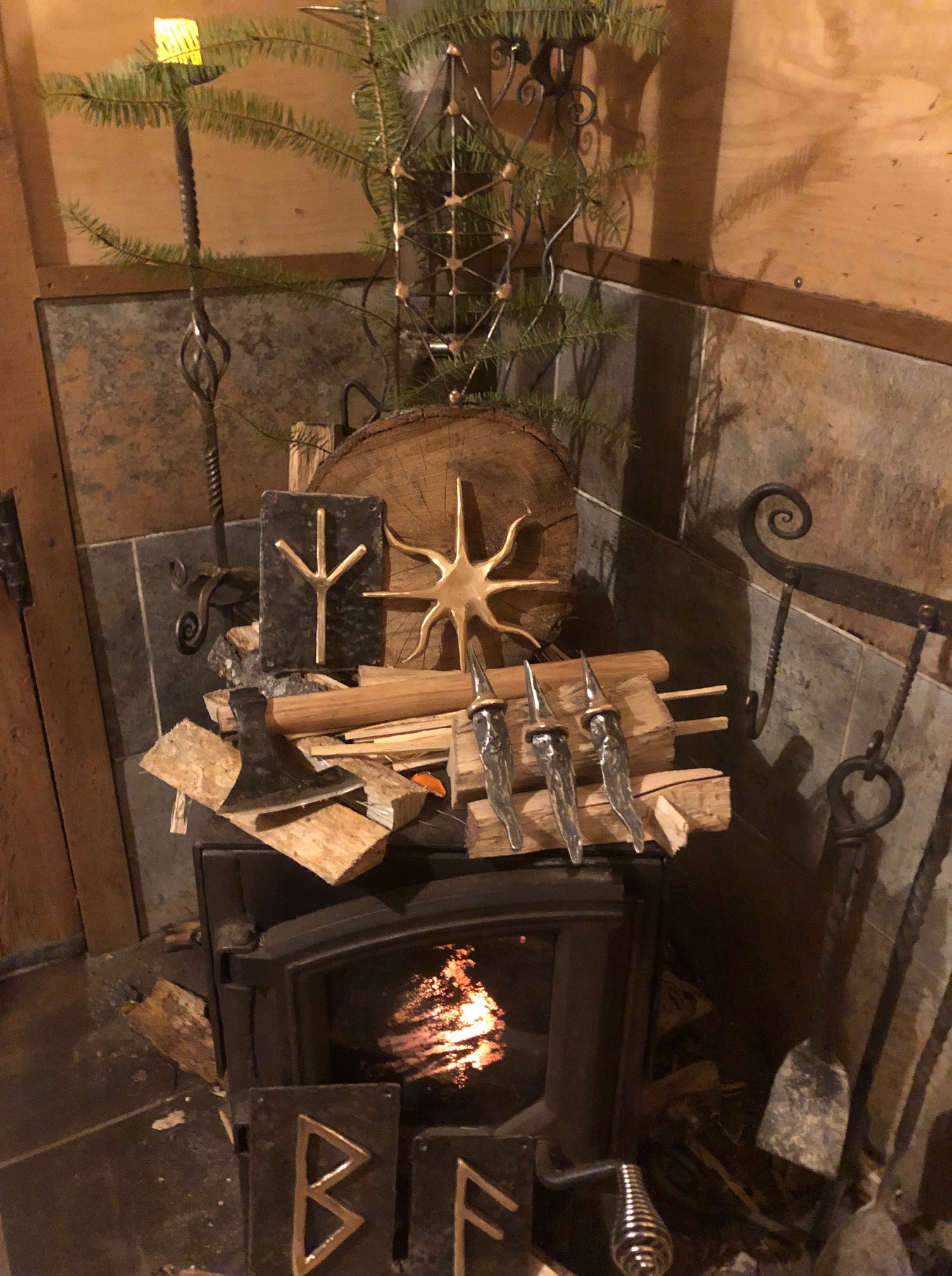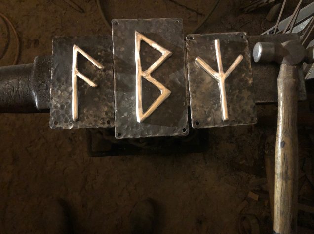 Some smaller steel and bronze pieces crafted over Yule: A New Hatchet which with its single edge symbolizes the the North as well as the left brain. A bronze Sun ornament aka the Reason for the Season. a Flock of Steel Hummingbird garden stakes. Three Hyperborean Rune wall Plaques: Ansuz, Odins rune, for Communication, omens and intelligence. Berkana Freya’s rune for growth, healing and the birch tree. Algiz the rune of Life for Protection resilience and the Stag. ( Please note that the Modern day Peace Sign symbol is actually an inverted Algiz which qualifies it as a Rune of Death.)