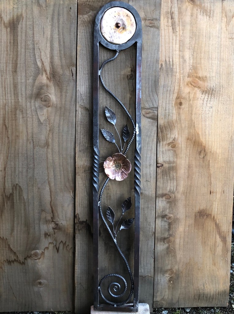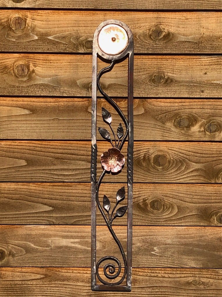 A decorative accent as an example of what I can weld into a larger project like a gate, arbor or porch railing. The primordial spiral, the wild rose,and the solar disc. Forged,welded and cast from 3/4″ steel square stock, 3/8″ rebar, 1/8″ welding rod, steel, copper ,and brass sheet metal, and poured bronze.