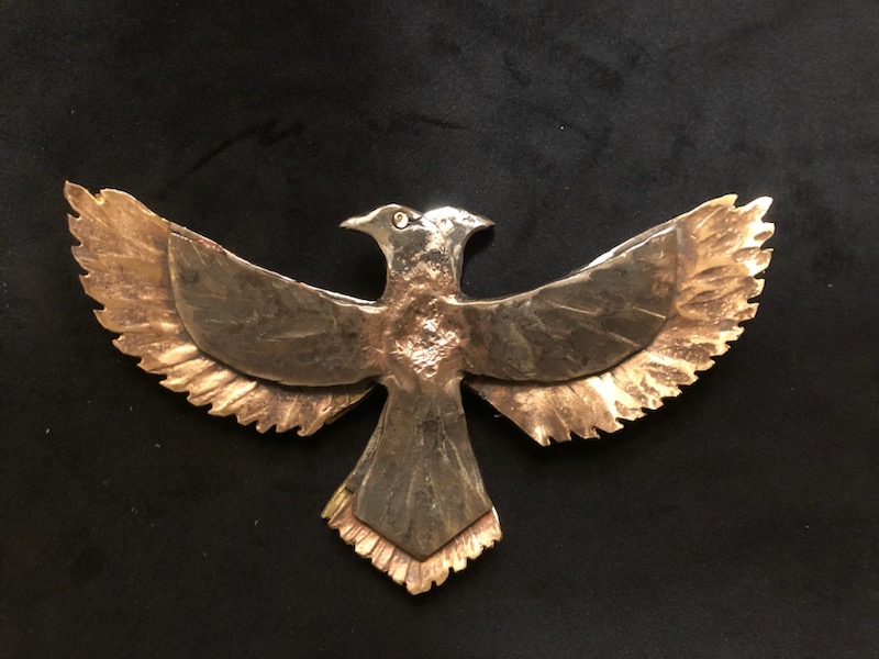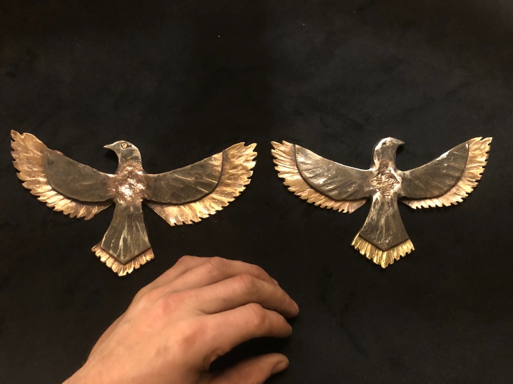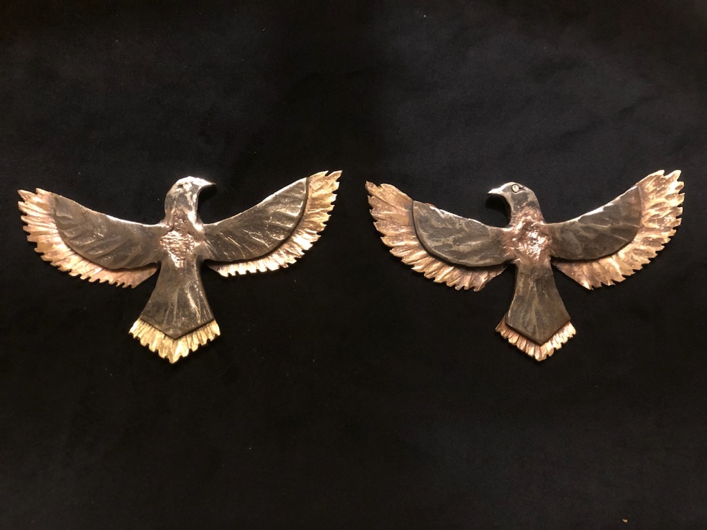 Forged and brazed steel and bronze Eagle emblems. The eagle has always been the symbol of the the thunder god or the planet Jupiter, who’s veneration is the root of what we consider traditional western values,Fathor, Order, Structure, Greatness, Gratitude, Monogamy, Marriage, Conversely the shadow of side of the eagle, is Wrath, bigotry, being condescending, authoritarianism. These characteristics are often misrepresented as christian in origin, but that is because the temples to the thunder god of various names were often transformed into christian churches during the conversion era. The church merely incorporated the existing values of peoples into the new paradigm. Indeed so much of what people love and want to defend about the West is actually based in the Pagan classical world and not on Christianity.